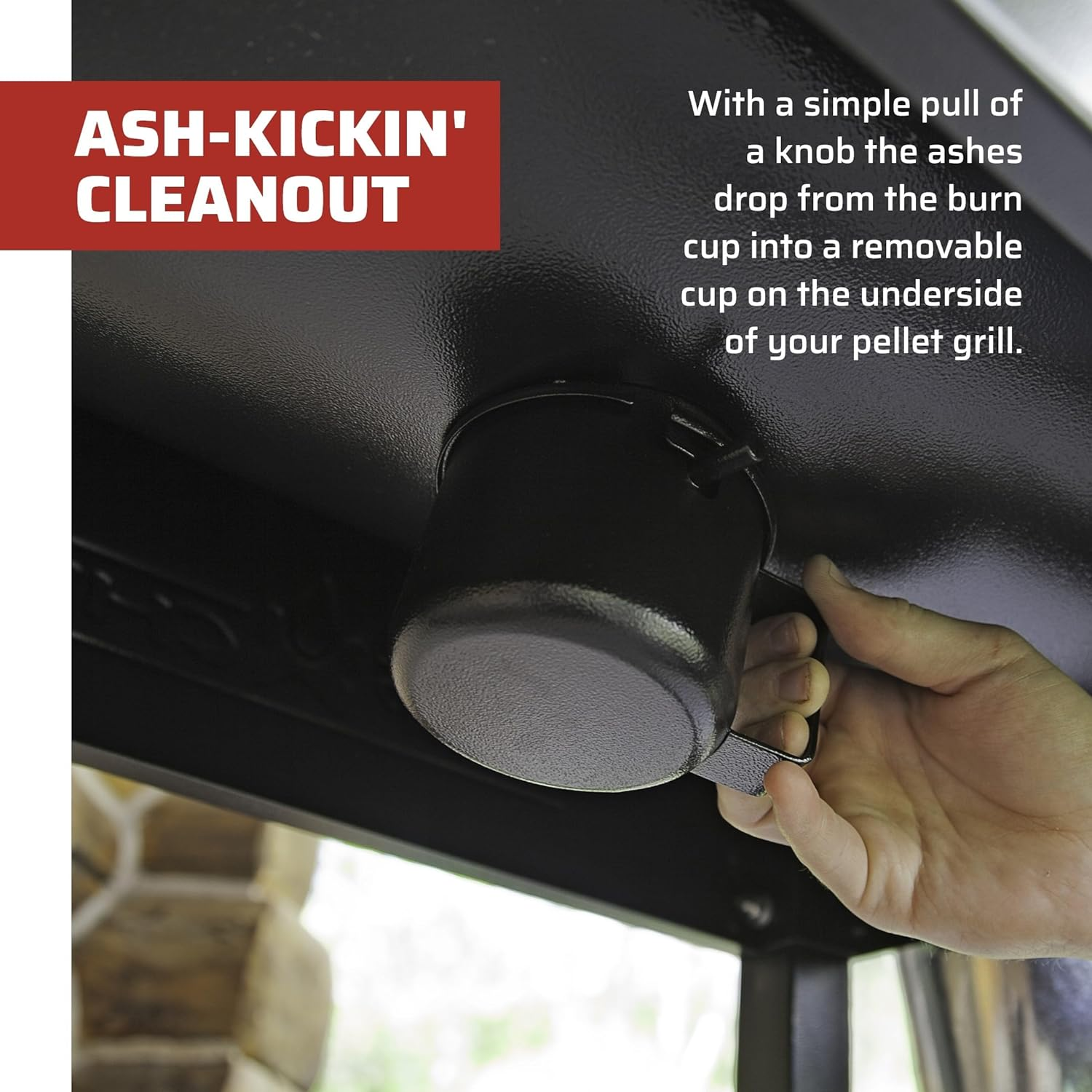 With a simple pull of a knob the ashes drop from the burn cup into a removable cup on the underside of your pellet grill. Do this between each cook for an easy, clean way to flush the burner and dispose of the ashes.
